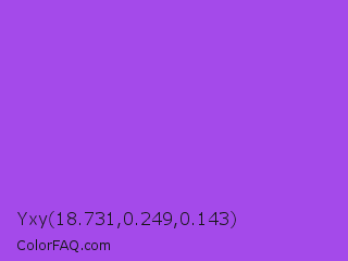 Yxy 18.731,0.249,0.143 Color is a normal purple color and the nearest color is Navy Purple #9457eb. Hex code #a44aea and RGB value is rgb(164,74,234). In RGB color space, this color is composed of 64% red, 29% green, 92% blue, In CMYK color space, this color is composed of 30% cyan, 68% magenta, 0% yellow , 8% black , In HSL color space, this color has a hue angle of 274° , 79% saturation and 60% lightness.