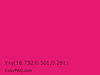 Yxy 18.732,0.501,0.261 Color is a normal rose color and the nearest color is Razzmatazz #e3256b. Hex code #e61970 and RGB value is rgb(230,25,112). In RGB color space, this color is composed of 90% red, 10% green, 44% blue, In CMYK color space, this color is composed of 0% cyan, 89% magenta, 51% yellow , 10% black , In HSL color space, this color has a hue angle of 335° , 80% saturation and 50% lightness.