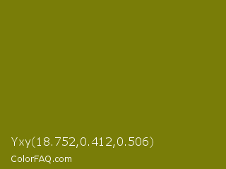Yxy 18.752,0.412,0.506 Color is a dark yellow color and the nearest color is Olive #808000. Hex code #797d08 and RGB value is rgb(121,125,8). In RGB color space, this color is composed of 47% red, 49% green, 3% blue, In CMYK color space, this color is composed of 3% cyan, 0% magenta, 94% yellow , 51% black , In HSL color space, this color has a hue angle of 62° , 88% saturation and 26% lightness.