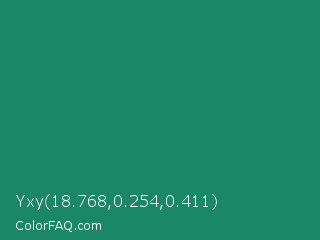 Yxy 18.768,0.254,0.411 Color is a normal green color and the nearest color is Eucalyptus #278a5b. Hex code #1b8865 and RGB value is rgb(27,136,101). In RGB color space, this color is composed of 11% red, 53% green, 40% blue, In CMYK color space, this color is composed of 80% cyan, 0% magenta, 26% yellow , 47% black , In HSL color space, this color has a hue angle of 161° , 67% saturation and 32% lightness.