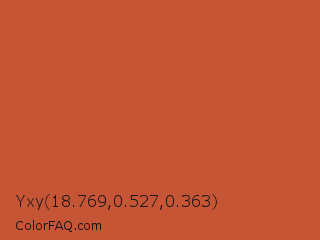 Yxy 18.769,0.527,0.363 Color is a normal red color and the nearest color is Tuscany #bd5e2e. Hex code #c65536 and RGB value is rgb(198,85,54). In RGB color space, this color is composed of 78% red, 33% green, 21% blue, In CMYK color space, this color is composed of 0% cyan, 57% magenta, 73% yellow , 22% black , In HSL color space, this color has a hue angle of 13° , 57% saturation and 49% lightness.