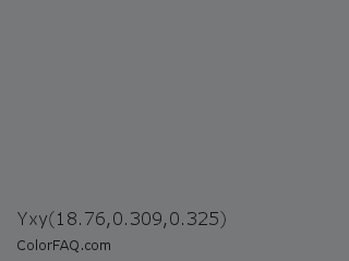 Yxy 18.76,0.309,0.325 Color is a normal blue color and the nearest color is Boulder #7a7a7a. Hex code #77787a and RGB value is rgb(119,120,122). In RGB color space, this color is composed of 47% red, 47% green, 48% blue, In CMYK color space, this color is composed of 2% cyan, 2% magenta, 0% yellow , 52% black , In HSL color space, this color has a hue angle of 220° , 1% saturation and 47% lightness.