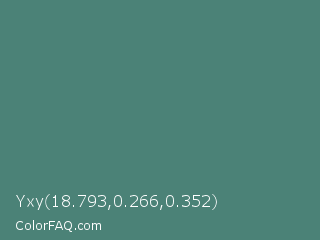 Yxy 18.793,0.266,0.352 Color is a normal cyan color and the nearest color is Faded Jade #427977. Hex code #4b8277 and RGB value is rgb(75,130,119). In RGB color space, this color is composed of 29% red, 51% green, 47% blue, In CMYK color space, this color is composed of 42% cyan, 0% magenta, 8% yellow , 49% black , In HSL color space, this color has a hue angle of 168° , 27% saturation and 40% lightness.