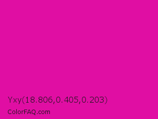 Yxy 18.806,0.405,0.203 Color is a normal magenta color and the nearest color is Hollywood Cerise #f400a1. Hex code #e00ea3 and RGB value is rgb(224,14,163). In RGB color space, this color is composed of 88% red, 5% green, 64% blue, In CMYK color space, this color is composed of 0% cyan, 94% magenta, 27% yellow , 12% black , In HSL color space, this color has a hue angle of 317° , 88% saturation and 47% lightness.