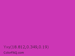 Yxy 18.812,0.349,0.19 Color is a normal magenta color and the nearest color is Byzantine #bd33a4. Hex code #cc36b5 and RGB value is rgb(204,54,181). In RGB color space, this color is composed of 80% red, 21% green, 71% blue, In CMYK color space, this color is composed of 0% cyan, 74% magenta, 11% yellow , 20% black , In HSL color space, this color has a hue angle of 309° , 60% saturation and 51% lightness.
