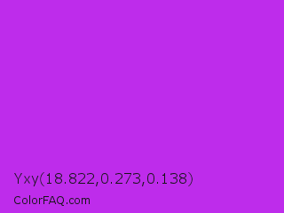 Yxy 18.822,0.273,0.138 Color is a normal purple color and the nearest color is Veronica #a020f0. Hex code #be2ceb and RGB value is rgb(190,44,235). In RGB color space, this color is composed of 75% red, 17% green, 92% blue, In CMYK color space, this color is composed of 19% cyan, 81% magenta, 0% yellow , 8% black , In HSL color space, this color has a hue angle of 286° , 83% saturation and 55% lightness.