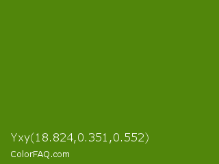 Yxy 18.824,0.351,0.552 Color is a dark green color and the nearest color is Avocado #568203. Hex code #51860b and RGB value is rgb(81,134,11). In RGB color space, this color is composed of 32% red, 53% green, 4% blue, In CMYK color space, this color is composed of 40% cyan, 0% magenta, 92% yellow , 47% black , In HSL color space, this color has a hue angle of 86° , 85% saturation and 28% lightness.