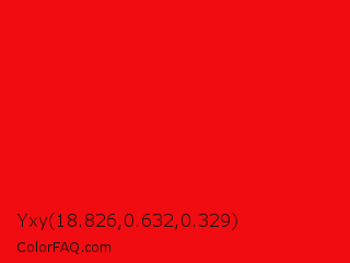 Yxy 18.826,0.632,0.329 Color is a normal red color and the nearest color is Vivid Red #f70d1a. Hex code #f00c10 and RGB value is rgb(240,12,16). In RGB color space, this color is composed of 94% red, 5% green, 6% blue, In CMYK color space, this color is composed of 0% cyan, 95% magenta, 93% yellow , 6% black , In HSL color space, this color has a hue angle of 359° , 90% saturation and 49% lightness.