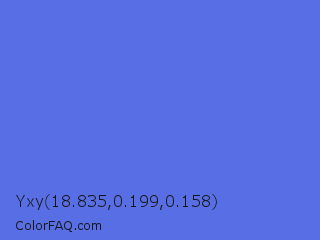 Yxy 18.835,0.199,0.158 Color is a light blue color and the nearest color is Royal Blue #4169e1. Hex code #586ee5 and RGB value is rgb(88,110,229). In RGB color space, this color is composed of 35% red, 43% green, 90% blue, In CMYK color space, this color is composed of 62% cyan, 52% magenta, 0% yellow , 10% black , In HSL color space, this color has a hue angle of 231° , 73% saturation and 62% lightness.