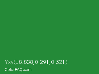 Yxy 18.838,0.291,0.521 Color is a normal green color and the nearest color is Forest Green #228b22. Hex code #248a38 and RGB value is rgb(36,138,56). In RGB color space, this color is composed of 14% red, 54% green, 22% blue, In CMYK color space, this color is composed of 74% cyan, 0% magenta, 59% yellow , 46% black , In HSL color space, this color has a hue angle of 132° , 59% saturation and 34% lightness.