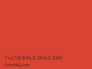 Yxy 18.844,0.564,0.344 Color is a normal red color and the nearest color is Punch #dc4333. Hex code #d84332 and RGB value is rgb(216,67,50). In RGB color space, this color is composed of 85% red, 26% green, 20% blue, In CMYK color space, this color is composed of 0% cyan, 69% magenta, 77% yellow , 15% black , In HSL color space, this color has a hue angle of 6° , 68% saturation and 52% lightness.