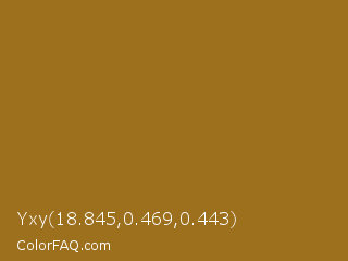 Yxy 18.845,0.469,0.443 Color is a normal orange color and the nearest color is Sand Dune #967117. Hex code #9d701d and RGB value is rgb(157,112,29). In RGB color space, this color is composed of 62% red, 44% green, 11% blue, In CMYK color space, this color is composed of 0% cyan, 29% magenta, 82% yellow , 38% black , In HSL color space, this color has a hue angle of 39° , 69% saturation and 36% lightness.