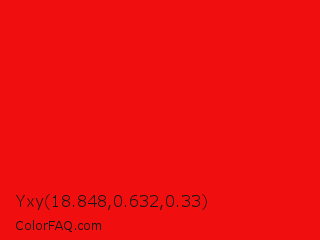 Yxy 18.848,0.632,0.33 Color is a normal red color and the nearest color is Vivid Red #f70d1a. Hex code #f00f0e and RGB value is rgb(240,15,14). In RGB color space, this color is composed of 94% red, 6% green, 5% blue, In CMYK color space, this color is composed of 0% cyan, 94% magenta, 94% yellow , 6% black , In HSL color space, this color has a hue angle of 0° , 89% saturation and 50% lightness.