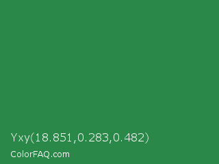Yxy 18.851,0.283,0.482 Color is a normal green color and the nearest color is Sea Green #2e8b57. Hex code #2a8948 and RGB value is rgb(42,137,72). In RGB color space, this color is composed of 16% red, 54% green, 28% blue, In CMYK color space, this color is composed of 69% cyan, 0% magenta, 47% yellow , 46% black , In HSL color space, this color has a hue angle of 139° , 53% saturation and 35% lightness.