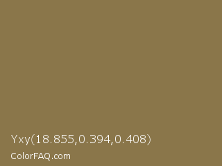 Yxy 18.855,0.394,0.408 Color is a normal orange color and the nearest color is Gold Fusion #85754e. Hex code #8a764a and RGB value is rgb(138,118,74). In RGB color space, this color is composed of 54% red, 46% green, 29% blue, In CMYK color space, this color is composed of 0% cyan, 14% magenta, 46% yellow , 46% black , In HSL color space, this color has a hue angle of 41° , 30% saturation and 42% lightness.