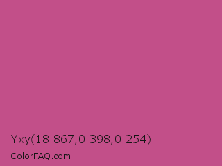 Yxy 18.867,0.398,0.254 Color is a normal rose color and the nearest color is Mulberry #c54b8c. Hex code #c24f89 and RGB value is rgb(194,79,137). In RGB color space, this color is composed of 76% red, 31% green, 54% blue, In CMYK color space, this color is composed of 0% cyan, 59% magenta, 29% yellow , 24% black , In HSL color space, this color has a hue angle of 330° , 49% saturation and 54% lightness.