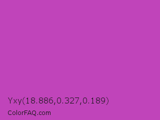 Yxy 18.886,0.327,0.189 Color is a normal magenta color and the nearest color is Fuchsia Pink #c154c1. Hex code #c044ba and RGB value is rgb(192,68,186). In RGB color space, this color is composed of 75% red, 27% green, 73% blue, In CMYK color space, this color is composed of 0% cyan, 65% magenta, 3% yellow , 25% black , In HSL color space, this color has a hue angle of 303° , 50% saturation and 51% lightness.