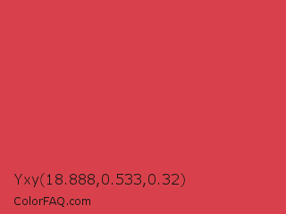 Yxy 18.888,0.533,0.32 Color is a normal red color and the nearest color is English Vermillion #cc474b. Hex code #d8414b and RGB value is rgb(216,65,75). In RGB color space, this color is composed of 85% red, 25% green, 29% blue, In CMYK color space, this color is composed of 0% cyan, 70% magenta, 65% yellow , 15% black , In HSL color space, this color has a hue angle of 356° , 66% saturation and 55% lightness.