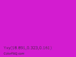 Yxy 18.891,0.323,0.161 Color is a normal magenta color and the nearest color is Steel Pink #cc33cc. Hex code #d11dcf and RGB value is rgb(209,29,207). In RGB color space, this color is composed of 82% red, 11% green, 81% blue, In CMYK color space, this color is composed of 0% cyan, 86% magenta, 1% yellow , 18% black , In HSL color space, this color has a hue angle of 301° , 76% saturation and 47% lightness.