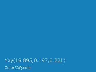 Yxy 18.895,0.197,0.221 Color is a normal blue color and the nearest color is Cyan Cornflower Blue #188bc2. Hex code #157fbb and RGB value is rgb(21,127,187). In RGB color space, this color is composed of 8% red, 50% green, 73% blue, In CMYK color space, this color is composed of 89% cyan, 32% magenta, 0% yellow , 27% black , In HSL color space, this color has a hue angle of 202° , 80% saturation and 41% lightness.