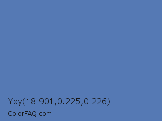 Yxy 18.901,0.225,0.226 Color is a normal blue color and the nearest color is Cyan Azure #4e82b4. Hex code #5579b4 and RGB value is rgb(85,121,180). In RGB color space, this color is composed of 33% red, 47% green, 71% blue, In CMYK color space, this color is composed of 53% cyan, 33% magenta, 0% yellow , 29% black , In HSL color space, this color has a hue angle of 217° , 39% saturation and 52% lightness.