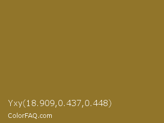 Yxy 18.909,0.437,0.448 Color is a normal orange color and the nearest color is Old Moss Green #867e36. Hex code #91752a and RGB value is rgb(145,117,42). In RGB color space, this color is composed of 57% red, 46% green, 16% blue, In CMYK color space, this color is composed of 0% cyan, 19% magenta, 71% yellow , 43% black , In HSL color space, this color has a hue angle of 44° , 55% saturation and 37% lightness.