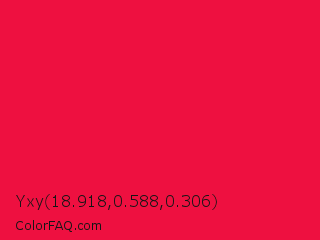 Yxy 18.918,0.588,0.306 Color is a normal red color and the nearest color is Red Ribbon #ed0a3f. Hex code #ee1040 and RGB value is rgb(238,16,64). In RGB color space, this color is composed of 93% red, 6% green, 25% blue, In CMYK color space, this color is composed of 0% cyan, 93% magenta, 73% yellow , 7% black , In HSL color space, this color has a hue angle of 347° , 87% saturation and 50% lightness.