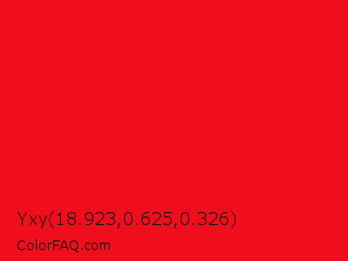 Yxy 18.923,0.625,0.326 Color is a normal red color and the nearest color is Vivid Red #f70d1a. Hex code #f00e1c and RGB value is rgb(240,14,28). In RGB color space, this color is composed of 94% red, 5% green, 11% blue, In CMYK color space, this color is composed of 0% cyan, 94% magenta, 88% yellow , 6% black , In HSL color space, this color has a hue angle of 356° , 89% saturation and 50% lightness.