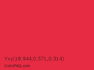 Yxy 18.944,0.571,0.314 Color is a normal red color and the nearest color is Imperial Red #ed2939. Hex code #e62b42 and RGB value is rgb(230,43,66). In RGB color space, this color is composed of 90% red, 17% green, 26% blue, In CMYK color space, this color is composed of 0% cyan, 81% magenta, 71% yellow , 10% black , In HSL color space, this color has a hue angle of 353° , 79% saturation and 54% lightness.