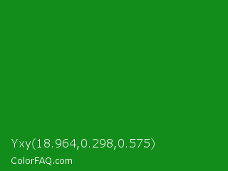 Yxy 18.964,0.298,0.575 Color is a normal green color and the nearest color is Forest Green #228b22. Hex code #128c1b and RGB value is rgb(18,140,27). In RGB color space, this color is composed of 7% red, 55% green, 11% blue, In CMYK color space, this color is composed of 87% cyan, 0% magenta, 81% yellow , 45% black , In HSL color space, this color has a hue angle of 124° , 77% saturation and 31% lightness.