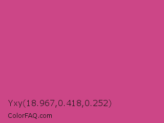 Yxy 18.967,0.418,0.252 Color is a normal rose color and the nearest color is Smitten #c84186. Hex code #cc4687 and RGB value is rgb(204,70,135). In RGB color space, this color is composed of 80% red, 27% green, 53% blue, In CMYK color space, this color is composed of 0% cyan, 66% magenta, 34% yellow , 20% black , In HSL color space, this color has a hue angle of 331° , 57% saturation and 54% lightness.