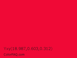 Yxy 18.987,0.603,0.312 Color is a normal red color and the nearest color is Red Ribbon #ed0a3f. Hex code #f00936 and RGB value is rgb(240,9,54). In RGB color space, this color is composed of 94% red, 4% green, 21% blue, In CMYK color space, this color is composed of 0% cyan, 96% magenta, 78% yellow , 6% black , In HSL color space, this color has a hue angle of 348° , 93% saturation and 49% lightness.