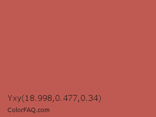 Yxy 18.998,0.477,0.34 Color is a normal red color and the nearest color is Fuzzy Wuzzy Brown #c45655. Hex code #bf5a52 and RGB value is rgb(191,90,82). In RGB color space, this color is composed of 75% red, 35% green, 32% blue, In CMYK color space, this color is composed of 0% cyan, 53% magenta, 57% yellow , 25% black , In HSL color space, this color has a hue angle of 4° , 46% saturation and 54% lightness.