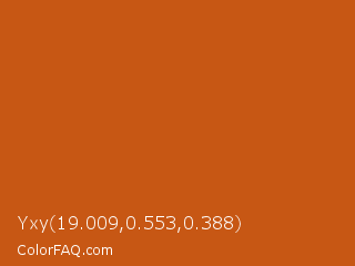 Yxy 19.009,0.553,0.388 Color is a normal orange color and the nearest color is Orange Roughy #c45719. Hex code #c75714 and RGB value is rgb(199,87,20). In RGB color space, this color is composed of 78% red, 34% green, 8% blue, In CMYK color space, this color is composed of 0% cyan, 56% magenta, 90% yellow , 22% black , In HSL color space, this color has a hue angle of 22° , 82% saturation and 43% lightness.