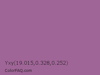 Yxy 19.015,0.328,0.252 Color is a normal magenta color and the nearest color is Strikemaster #956387. Hex code #a06597 and RGB value is rgb(160,101,151). In RGB color space, this color is composed of 63% red, 40% green, 59% blue, In CMYK color space, this color is composed of 0% cyan, 37% magenta, 6% yellow , 37% black , In HSL color space, this color has a hue angle of 309° , 24% saturation and 51% lightness.