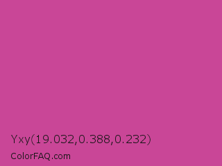 Yxy 19.032,0.388,0.232 Color is a normal magenta color and the nearest color is Mulberry #c54b8c. Hex code #c94697 and RGB value is rgb(201,70,151). In RGB color space, this color is composed of 79% red, 27% green, 59% blue, In CMYK color space, this color is composed of 0% cyan, 65% magenta, 25% yellow , 21% black , In HSL color space, this color has a hue angle of 323° , 55% saturation and 53% lightness.