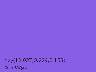 Yxy 19.037,0.229,0.153 Color is a light indigo color and the nearest color is Navy Purple #9457eb. Hex code #885ee6 and RGB value is rgb(136,94,230). In RGB color space, this color is composed of 53% red, 37% green, 90% blue, In CMYK color space, this color is composed of 41% cyan, 59% magenta, 0% yellow , 10% black , In HSL color space, this color has a hue angle of 259° , 73% saturation and 64% lightness.