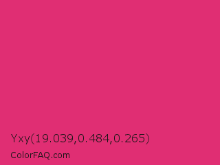 Yxy 19.039,0.484,0.265 Color is a normal rose color and the nearest color is Razzmatazz #e3256b. Hex code #e02e73 and RGB value is rgb(224,46,115). In RGB color space, this color is composed of 88% red, 18% green, 45% blue, In CMYK color space, this color is composed of 0% cyan, 79% magenta, 49% yellow , 12% black , In HSL color space, this color has a hue angle of 337° , 74% saturation and 53% lightness.
