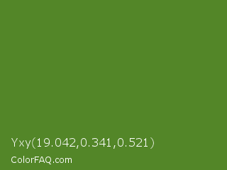 Yxy 19.042,0.341,0.521 Color is a normal green color and the nearest color is Sap Green #507d2a. Hex code #538628 and RGB value is rgb(83,134,40). In RGB color space, this color is composed of 33% red, 53% green, 16% blue, In CMYK color space, this color is composed of 38% cyan, 0% magenta, 70% yellow , 47% black , In HSL color space, this color has a hue angle of 93° , 54% saturation and 34% lightness.