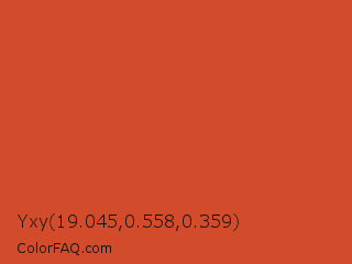 Yxy 19.045,0.558,0.359 Color is a normal red color and the nearest color is Valencia #d84437. Hex code #d24c2b and RGB value is rgb(210,76,43). In RGB color space, this color is composed of 82% red, 30% green, 17% blue, In CMYK color space, this color is composed of 0% cyan, 64% magenta, 80% yellow , 18% black , In HSL color space, this color has a hue angle of 12° , 66% saturation and 50% lightness.