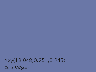 Yxy 19.048,0.251,0.245 Color is a normal blue color and the nearest color is Lynch #697e9a. Hex code #6a77a7 and RGB value is rgb(106,119,167). In RGB color space, this color is composed of 42% red, 47% green, 65% blue, In CMYK color space, this color is composed of 37% cyan, 29% magenta, 0% yellow , 35% black , In HSL color space, this color has a hue angle of 227° , 26% saturation and 54% lightness.