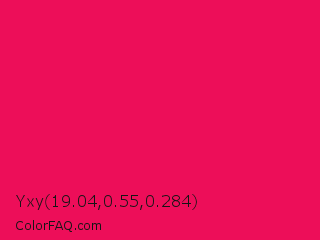 Yxy 19.04,0.55,0.284 Color is a normal rose color and the nearest color is Razzmatazz Crayola #e30b5c. Hex code #ed0e59 and RGB value is rgb(237,14,89). In RGB color space, this color is composed of 93% red, 5% green, 35% blue, In CMYK color space, this color is composed of 0% cyan, 94% magenta, 62% yellow , 7% black , In HSL color space, this color has a hue angle of 340° , 89% saturation and 49% lightness.