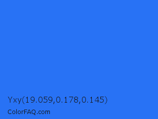 Yxy 19.059,0.178,0.145 Color is a normal blue color and the nearest color is Blue Crayola #1f75fe. Hex code #2872f5 and RGB value is rgb(40,114,245). In RGB color space, this color is composed of 16% red, 45% green, 96% blue, In CMYK color space, this color is composed of 84% cyan, 53% magenta, 0% yellow , 4% black , In HSL color space, this color has a hue angle of 218° , 91% saturation and 56% lightness.