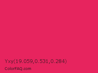 Yxy 19.059,0.531,0.284 Color is a normal rose color and the nearest color is Razzmatazz #e3256b. Hex code #e7245e and RGB value is rgb(231,36,94). In RGB color space, this color is composed of 91% red, 14% green, 37% blue, In CMYK color space, this color is composed of 0% cyan, 84% magenta, 59% yellow , 9% black , In HSL color space, this color has a hue angle of 342° , 80% saturation and 52% lightness.