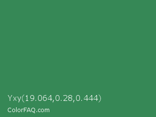 Yxy 19.064,0.28,0.444 Color is a normal green color and the nearest color is Sea Green #2e8b57. Hex code #368856 and RGB value is rgb(54,136,86). In RGB color space, this color is composed of 21% red, 53% green, 34% blue, In CMYK color space, this color is composed of 60% cyan, 0% magenta, 37% yellow , 47% black , In HSL color space, this color has a hue angle of 143° , 43% saturation and 37% lightness.