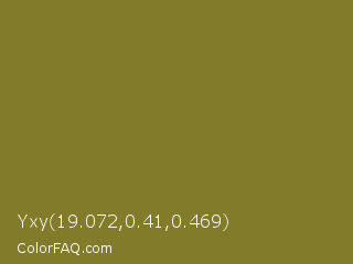Yxy 19.072,0.41,0.469 Color is a normal yellow color and the nearest color is Spanish Bistre #807532. Hex code #827b29 and RGB value is rgb(130,123,41). In RGB color space, this color is composed of 51% red, 48% green, 16% blue, In CMYK color space, this color is composed of 0% cyan, 5% magenta, 68% yellow , 49% black , In HSL color space, this color has a hue angle of 55° , 52% saturation and 34% lightness.
