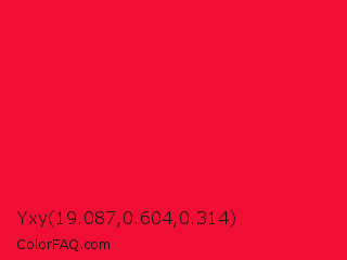 Yxy 19.087,0.604,0.314 Color is a normal red color and the nearest color is Red Ribbon #ed0a3f. Hex code #f00e34 and RGB value is rgb(240,14,52). In RGB color space, this color is composed of 94% red, 5% green, 20% blue, In CMYK color space, this color is composed of 0% cyan, 94% magenta, 78% yellow , 6% black , In HSL color space, this color has a hue angle of 350° , 89% saturation and 50% lightness.
