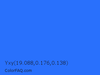 Yxy 19.088,0.176,0.138 Color is a normal blue color and the nearest color is Blue Crayola #1f75fe. Hex code #2970fc and RGB value is rgb(41,112,252). In RGB color space, this color is composed of 16% red, 44% green, 99% blue, In CMYK color space, this color is composed of 84% cyan, 56% magenta, 0% yellow , 1% black , In HSL color space, this color has a hue angle of 220° , 97% saturation and 57% lightness.