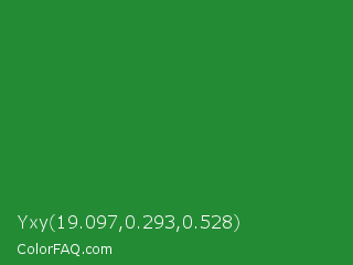 Yxy 19.097,0.293,0.528 Color is a normal green color and the nearest color is Forest Green #228b22. Hex code #248b35 and RGB value is rgb(36,139,53). In RGB color space, this color is composed of 14% red, 55% green, 21% blue, In CMYK color space, this color is composed of 74% cyan, 0% magenta, 62% yellow , 45% black , In HSL color space, this color has a hue angle of 130° , 59% saturation and 34% lightness.