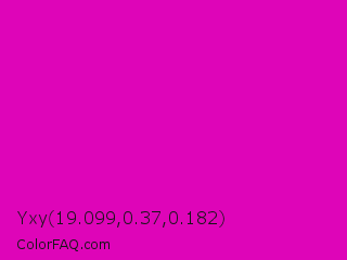 Yxy 19.099,0.37,0.182 Color is a normal magenta color and the nearest color is Deep Magenta #cc00cc. Hex code #de05b8 and RGB value is rgb(222,5,184). In RGB color space, this color is composed of 87% red, 2% green, 72% blue, In CMYK color space, this color is composed of 0% cyan, 98% magenta, 17% yellow , 13% black , In HSL color space, this color has a hue angle of 311° , 96% saturation and 45% lightness.